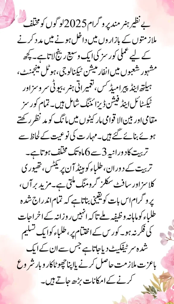 The Benazir Hunarmand Program 2025 brings a wide range of practical courses to help people enter different job markets. Some of the popular fields include Information Technology, Hotel Management, Health and Paramedics, Construction Skills, Beauty Services and Textile & Fashion Designing. All courses are designed keeping in mind the demand in local and international markets. The training duration varies from 3 to 6 months depending on the nature of the skill.