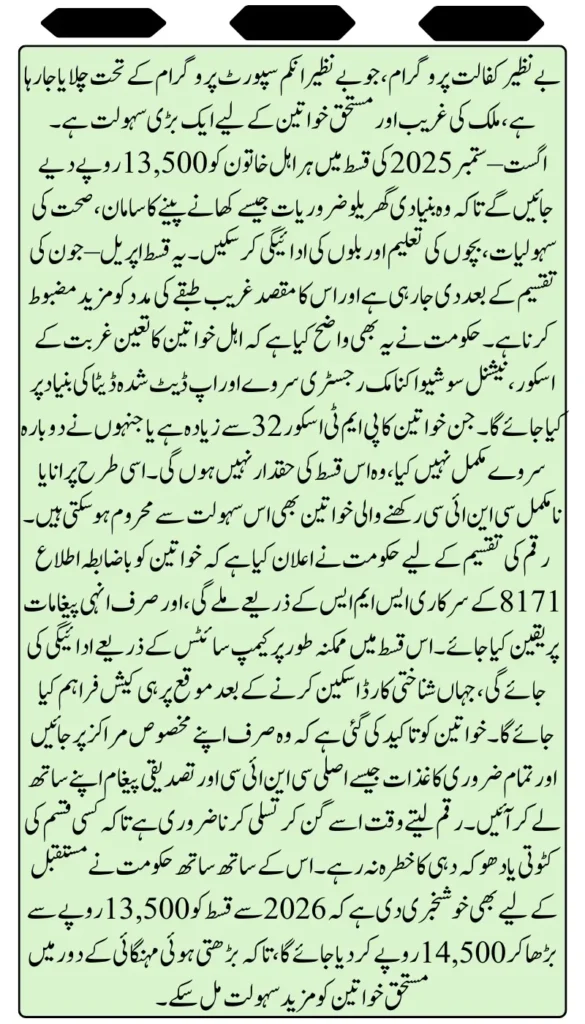 The Benazir Kafaalat Program under the Benazir Income Support Programme (BISP) continues to serve as a major lifeline for poor and low-income women across Pakistan. In the latest update for the August–September 2025 cycle, each eligible beneficiary is expected to receive Rs. 14,500 as financial assistance. This payment aims to support women in managing essential household needs such as food, healthcare, utilities, and children’s education.