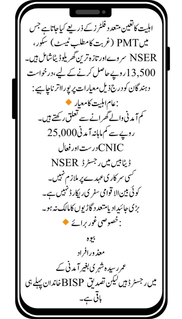 Eligibility is determined through multiple filters including the PMT (Poverty Means Test) Score, NSER survey, and updated household data. To receive the Rs.13,500, applicants must meet the following criteria: