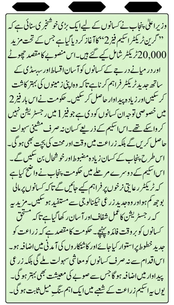 The application process for the Chief Minister Punjab Green Tractor Scheme Phase II is very easy, which ensures that only needy farmers can benefit from this program. Interested farmers will have to submit their National Identity Card, land ownership papers, and proof of cultivation. After preparing all these documents, the applicant should go to their nearest Agriculture Department office and submit the required documents there.