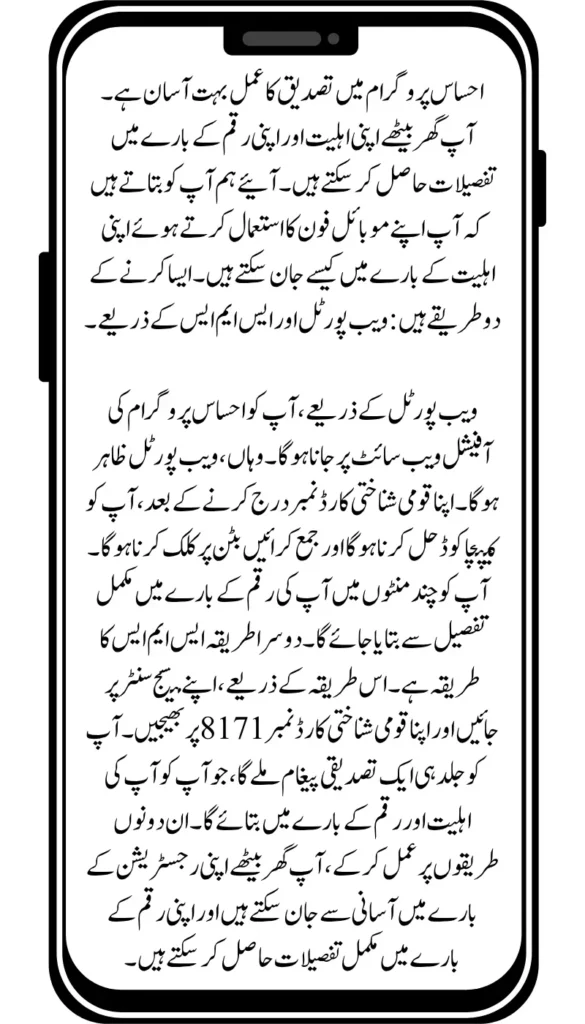Through the web portal, you have to go to the official website of the Ehsaas program. There, the web portal will appear. After entering your national identity card number, you have to solve the captcha code and click on the submit button. You will be told about your amount in complete detail within a few minutes. The second method is the SMS method. Through this method, go to your message center and send your national identity card number to 8171. You will receive a confirmation message soon, which will tell you about your eligibility and the amount. By following both these methods, you can easily know about your registration while sitting at home and get complete details about your amount.