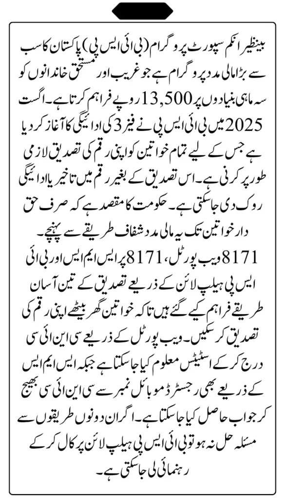 By verifying through the proper channels, you avoid long lines, unexpected delays, or third-party fraud. BISP Phase 3 ensures that every eligible woman can receive her due amount without unnecessary stress, extra visits to the Tehsil Office, or paying any hidden charges to agents.