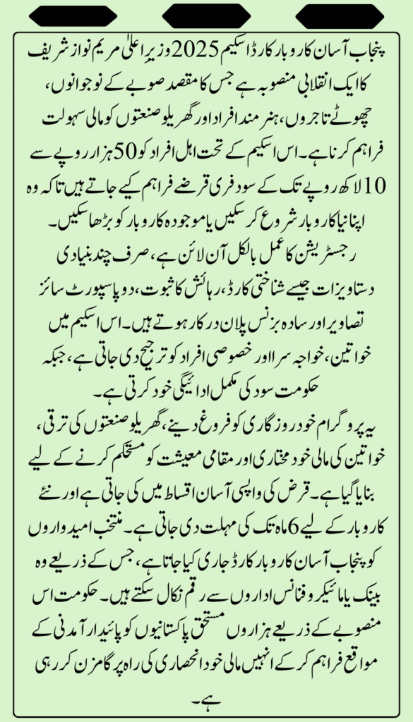 The Punjab Asan Karobar Card Scheme 2025 is a groundbreaking initiative launched by Chief Minister Maryam Nawaz Sharif to empower the youth, small traders, and cottage industries across Punjab. Under this scheme, eligible individuals can access interest-free business loans of up to Rs. 10 lakh, enabling them to start or expand their own small businesses without the burden of bank interest.